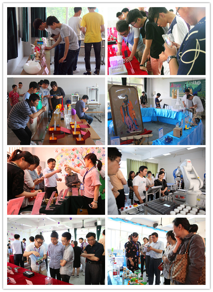 此外,活动现场设置了“创客作品展示”区域,集中展示了近两千件校内外创客作品,作品既有开元师生创新创意作品,又有来自企业的Brookstorn、智能硬件等新奇特产品,同时还吸引了江宁金箔、烙画、方山裱画、剪纸等江宁非遗项目作品参展,另外,现场还有大学生创业项目产品的展销活动。现场也开设了3D打印、激光切割、激光内雕、热转印、无人机、VR、arduino、乐高机器人、智能家居、系统集成、软件设计、艺术设计、陶艺等15个创客工坊体验,由创客导师现场操作演示,指导校内外创客体验新科技。而以表演赛形式呈现的“2对2足球机器人”竞赛、“马球机器人”等新式运动,给校内外创客们带来充满活力与智慧的体验。