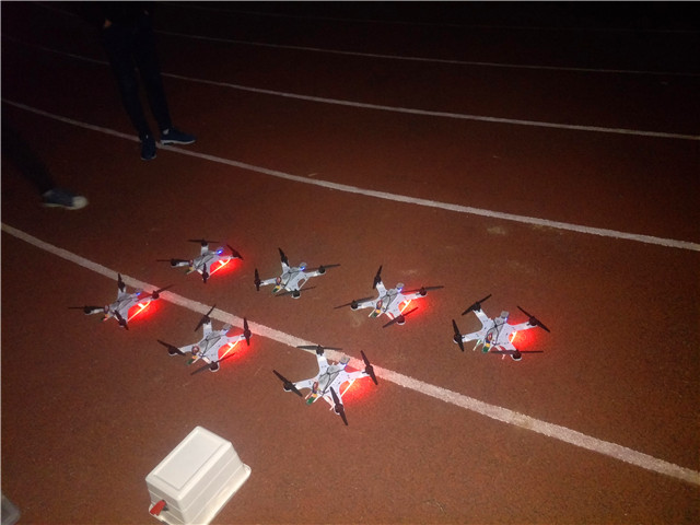 最后,赵博士团队在操场上进行了无人机协同编队飞行表演,八架无人机同时起飞,在空中编队构成各种数字和图案,并根据灯光变换颜色,配上激动人心的音乐,整场表演非常精彩。赵博士补充道,编队队形的设计,既要让各个无人机按照预定的队形排列,又要确保相互不碰撞,需要架构专用软件,从设计到最后的调试,耗时近3年。赵博士关于队形设计、气动耦合、队形的动态调整、航迹规划、信息互换以及编队飞行控制策略等技术的研发已位于国际领先地位,并将于近期参加“国际分布式智能开放挑战赛”这一飞行界“奥运会”。飞行表演让师生们大饱眼福,大呼过瘾,大家不仅享受到了无人机表演带来的高科技视觉盛宴,也激发了师生们学习无人机的兴趣。