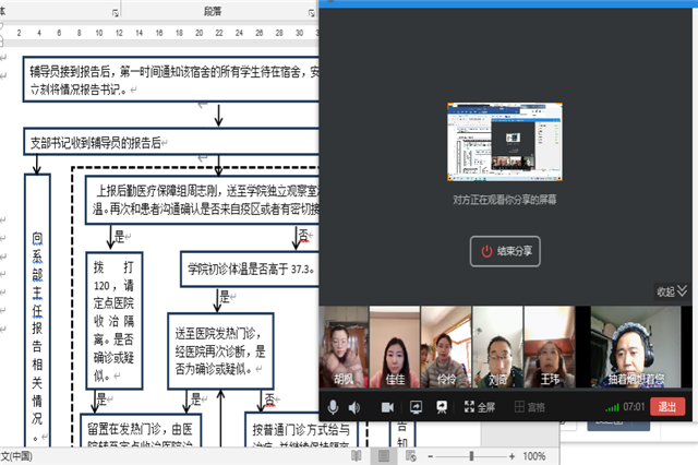 情景模拟 精准演练近期学院各部门都通过教职工自学、支部在线讨论、线上集中学习等措施学习了"学院疫情防控专项方案"及相关的疫情科学知识。以信息工程系为例为深化学院疫情防控专项方案的学习,信息工程系创设了具体情境案例,系部教职员工分5个小组,每个小组4个案例,进行深入讨论学习,同时要求针对案例梳理文件,罗列出处理流程并画出流程图。各小组领取到系部创设的情境案例后,立即组织小组成员,创建讨论群,认真分析情境案例情况,组织在线会议对照学院整体方案和具体处理流程,从开学报到当天、学生宿舍、教室上课期间、教师自驾、班车上班途中等几种情境下出现发热、咳嗽等情况时该如何处理进行了激烈的讨论和学习,大家纷纷提出具体处理方案和流程。这种情景模拟是对开学后应对与疫情相关的紧急突发事件最精准可行的预演。