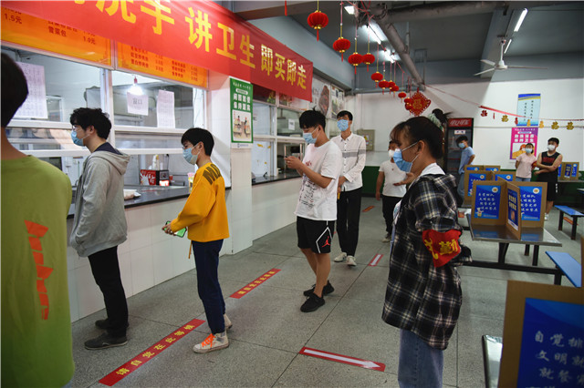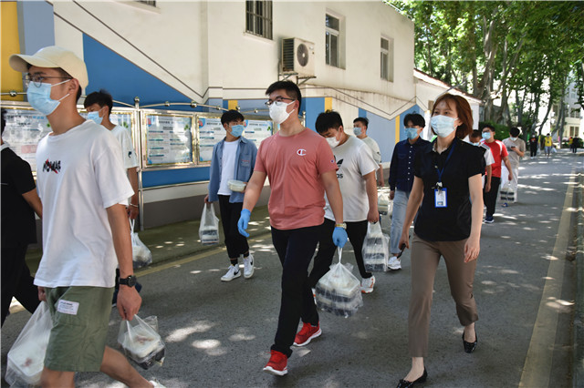 随着学生的大量到来,食堂也成为学校疫情防控的重点,观察期期间每个宿舍派出代表跟随值班老师去食堂打餐后统一带回宿舍用餐,教师志愿者和学生志愿者在食堂入口处为师生检测体温,确保所有用餐人员体温正常才能进入。执勤的志愿者时刻提醒打餐的同学们保持一米距离。