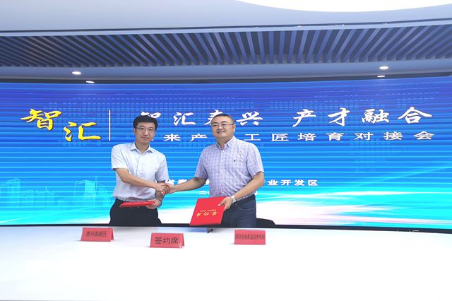学院副院长刁爱军代表学院与江苏省泰兴高新技术产业开发区签订《产才融合战略合作协议》,学院党委书记、院长周庆礼向江苏省泰兴高新技术产业开发区授予“开元未来产业工匠培育基地”铜牌。