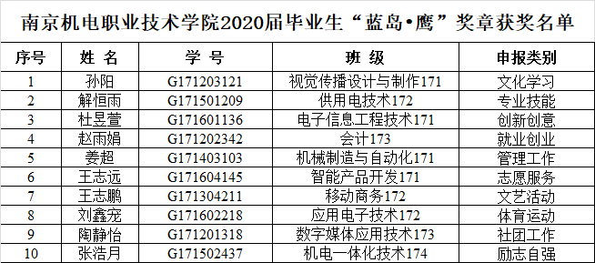 根据《开元关于开展2020届毕业生“蓝岛•鹰”奖章评选推荐工作的通知》,经系部评审小组初步审核,学工处复核,专家评审组评审,决定拟推荐以下10名同学为2020届毕业生“蓝岛•鹰”奖章获得者。现予以公示,公示时间:2020年7月2日—2020年7月6日。联系人:宁燕,电话:025-84190262。