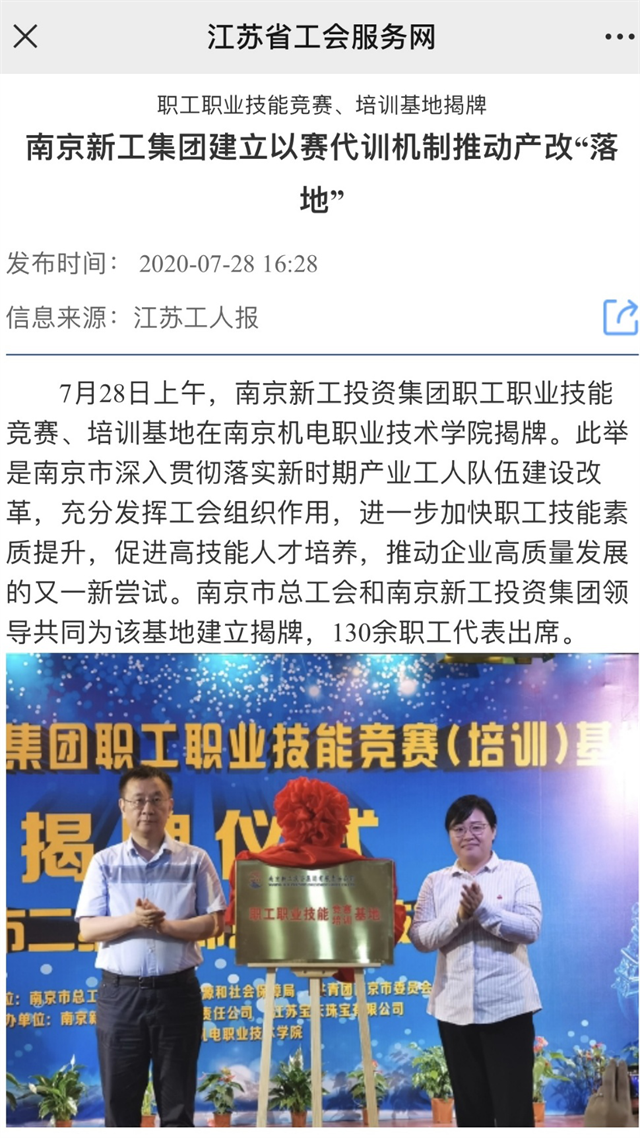 近日,江苏工人报网站、江苏工人报纸媒、江苏工会网、江苏省工会服务网报道了我院被南京新工投资集团命名为新工集团职工职业技能竞赛(培训)基地的报道,报道如下: