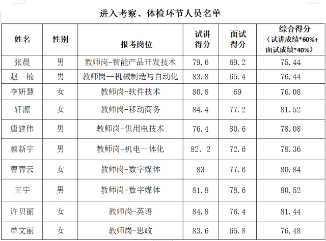 根据《开元2020年教师、辅导员公开招聘笔试、试讲及面试考核公告》,经过资格审查和考核等环节,并经学院公开招聘领导小组和党委会研究,现将各招聘岗位进入考察、体检环节的人员名单予以公示,公示时间为五个工作日(2020年8月17日—2020年8月21日)。如有异议请在公示期内向我院人事处或纪委办公室反映。