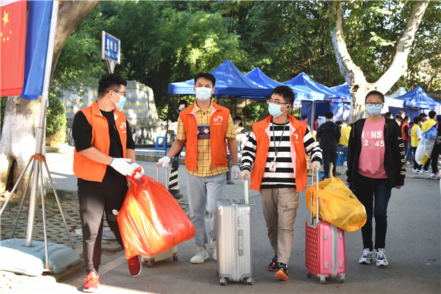 按照疫情防控要求,今年新生报到期间,家长原则上不入校。志愿者在火车站和高铁站开展接站服务,系部师生志愿者们全部出动,帮助入校报到的新生运送行李,让不能陪同的父母安心。扫码报到,领取材料,手续简单,但心意温暖。报到流程、行李搬运、指路问路曾经懵懵懂懂进入校园的志愿者们变成了为新生们保驾护航的学长学姐。