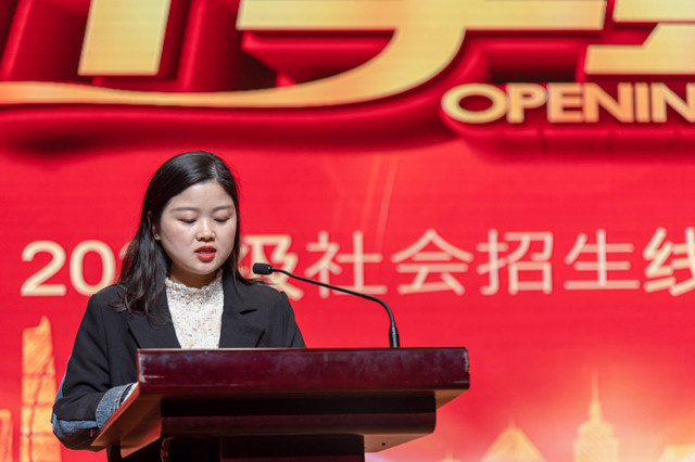 2020级社招会计专业学生,来自江苏五丰建设工程有限公司财务经理惠平平同志作为学姐代表发言。她从自身一学年的学习感受出发给学弟学妹们分享了三个关键词:勤勉、坚持、实践。