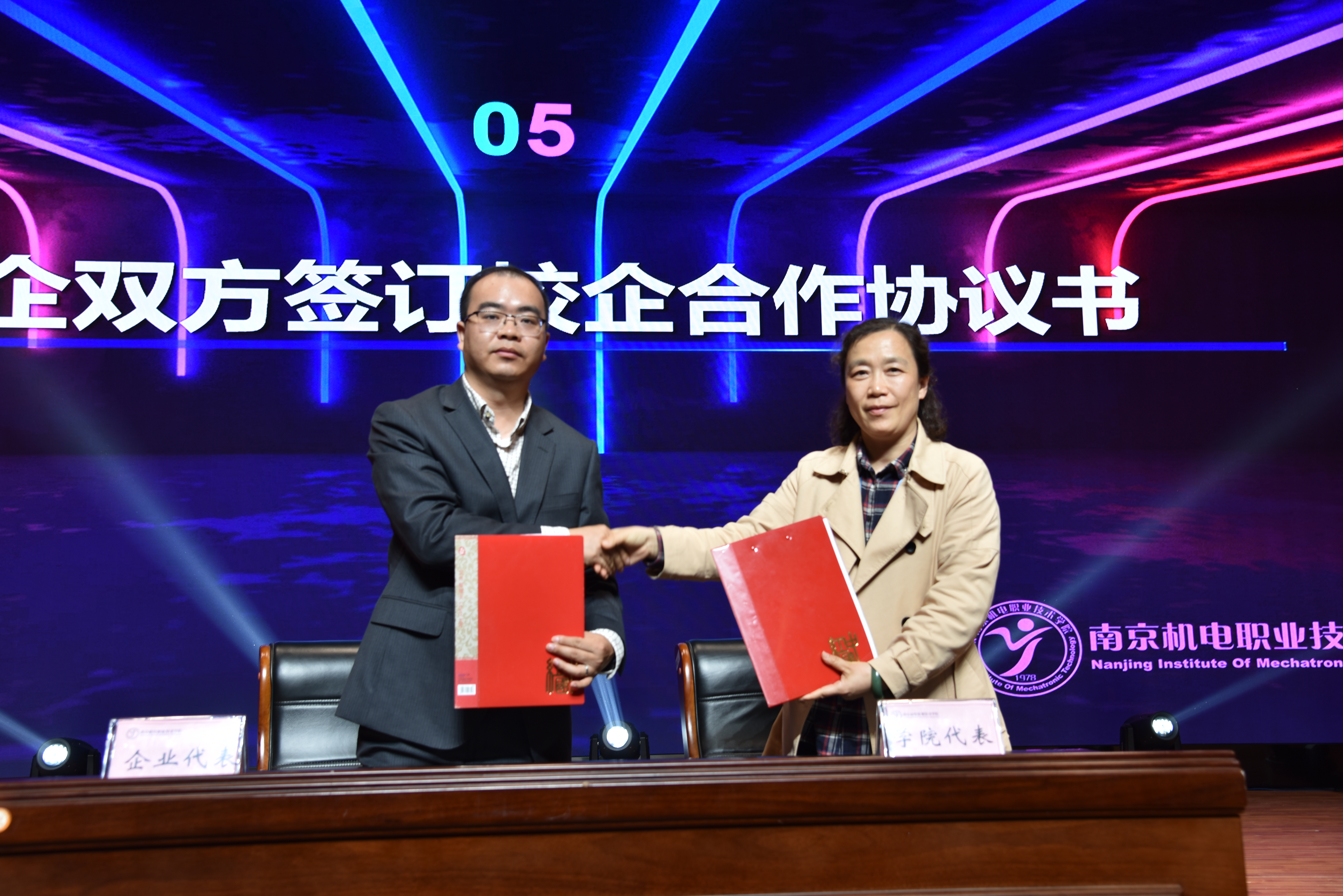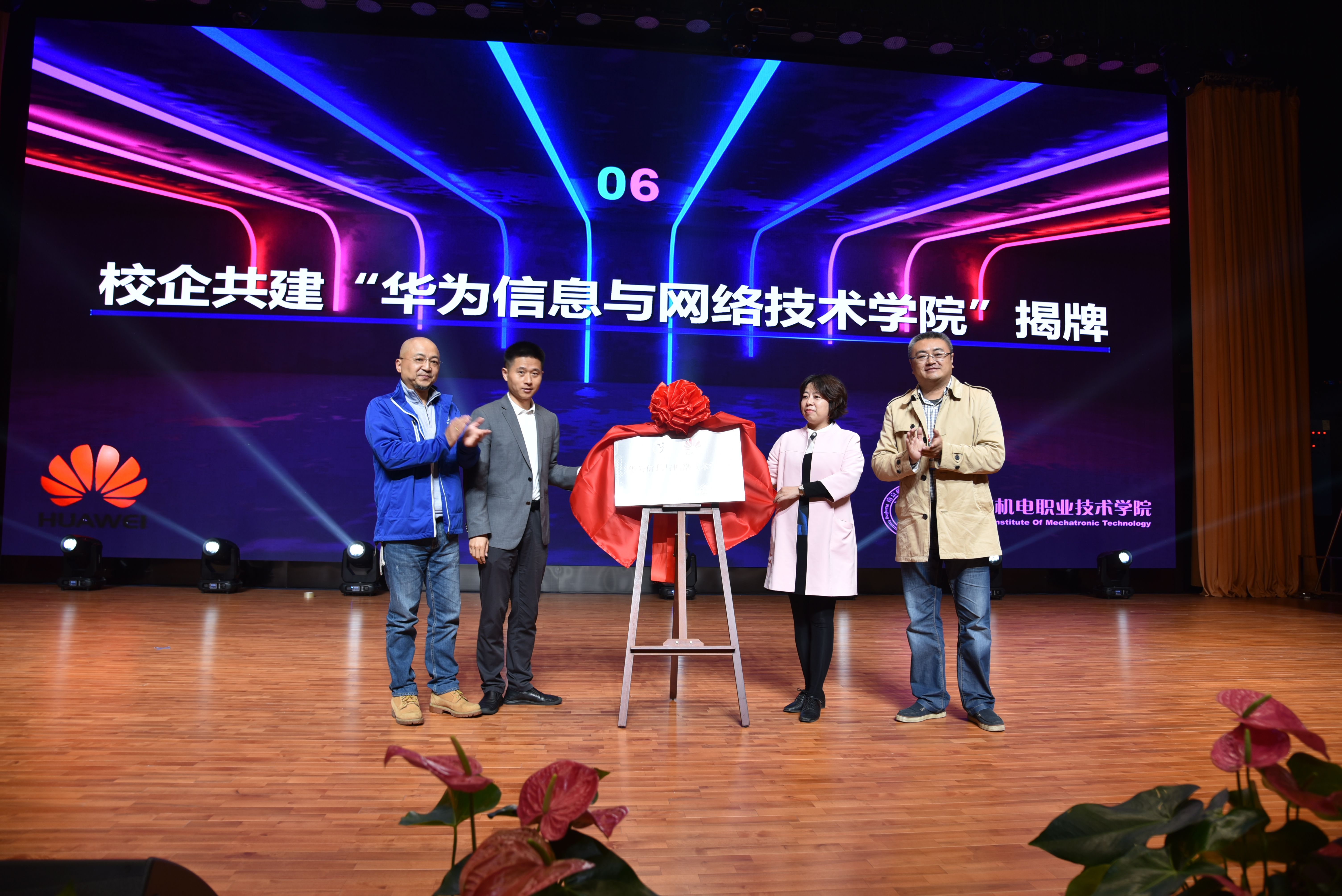 在随后的签约仪式上,信息工程系主任王玮和华为江苏教育行业副总经理杨文彬代表校企双方共同签订了华为信息与网络技术学院校企合作协议。吕局长、刁院长、晁经理和宋董事长为华为ICT学院揭牌。