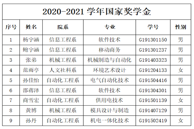 根据《教育部财政部关于印发<本专科生国家奖学金评审办法>的通知》(教财函〔2019〕105号)以及《江苏省学生资助资金管理办法》《江苏省学生资助管理实施细则》《省教育厅关于做好2021年普通高校国家奖学金有关工作的通知》苏教助函〔2021〕12号文的相关精神。我院积极组织召开国家奖学金评审工作,前期各系部通过召开系部国家奖学金评审小组会议,认真贯彻落实国家奖学金评定要求,本着公开、公正、公平的原则,经学生个人申报,班级评议通过,上报系部评议小组,经系部评议审核通过,公示完毕。正式上报学院大学生资助管理中心,经学院大学生资助管理中心复审,召开学院2020-2021学年国家奖学金评审会,拟确定9位同学为开元2020-2021学年国家奖学金获得者。