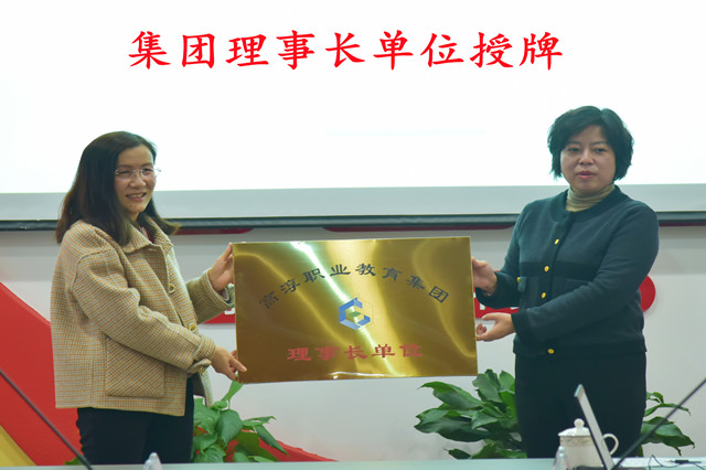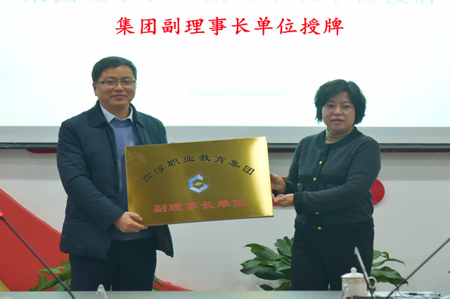 会上高淳区教育局副局长吕明霞、开元党委副书记陈赵共同为高淳职业教育集团揭牌。吕明霞为集团理事长、副理事长单位授牌。