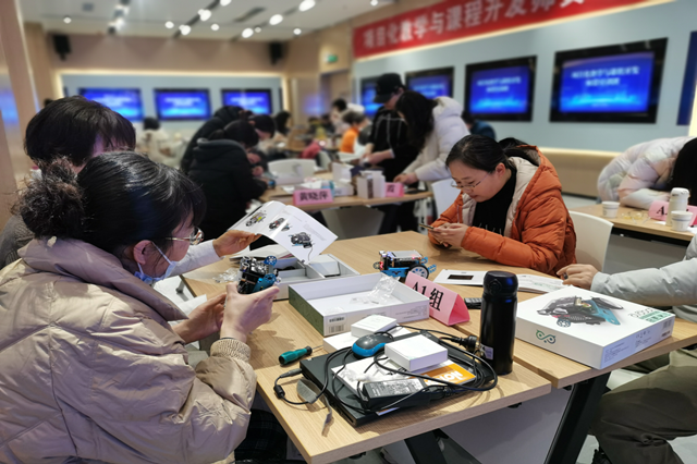 培训项目训练分为三个部分:摩天大楼的设计与实现、基于Python的智能机器人的设计与装调、基于STEAM教育理念的机械小手臂装调。老师们通过小组合作,从项目的设计、搭建到调试、路演,深入体会项目化教学在课程改革中的运用。