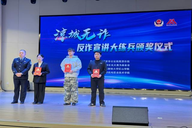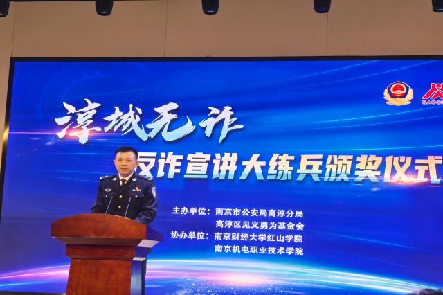 2024年12月18日高淳区“淳城无诈”反诈宣讲大练兵颁奖仪式在南京财经大学红山学院鹿鸣剧场顺利开展。区领导陆炼、张毓华,市公安局政治部宣传处、反诈支队负责人,区公安分局、区见义勇为基金会、妇联、教育局、融媒体中心、农商行、各镇街、开发区、高职园分管负责人出席颁奖仪式,我校党委副书记、副校长赵学洪参会并为我校获奖选手颁奖。