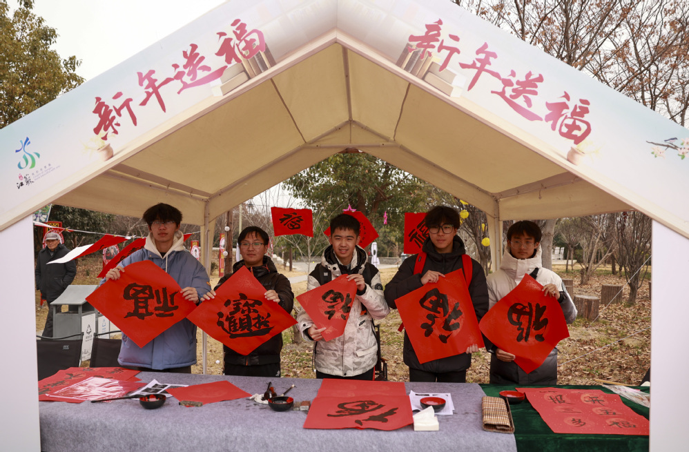 活动现场,书画爱好者们齐聚一堂,挥毫泼墨,用笔尖传递情感和祝福。不时有同学与村民和游客一起与当地书法家进行互动,书法爱好者耐心指导学生写福字,并一起将写好的“福”和春联送给群众。