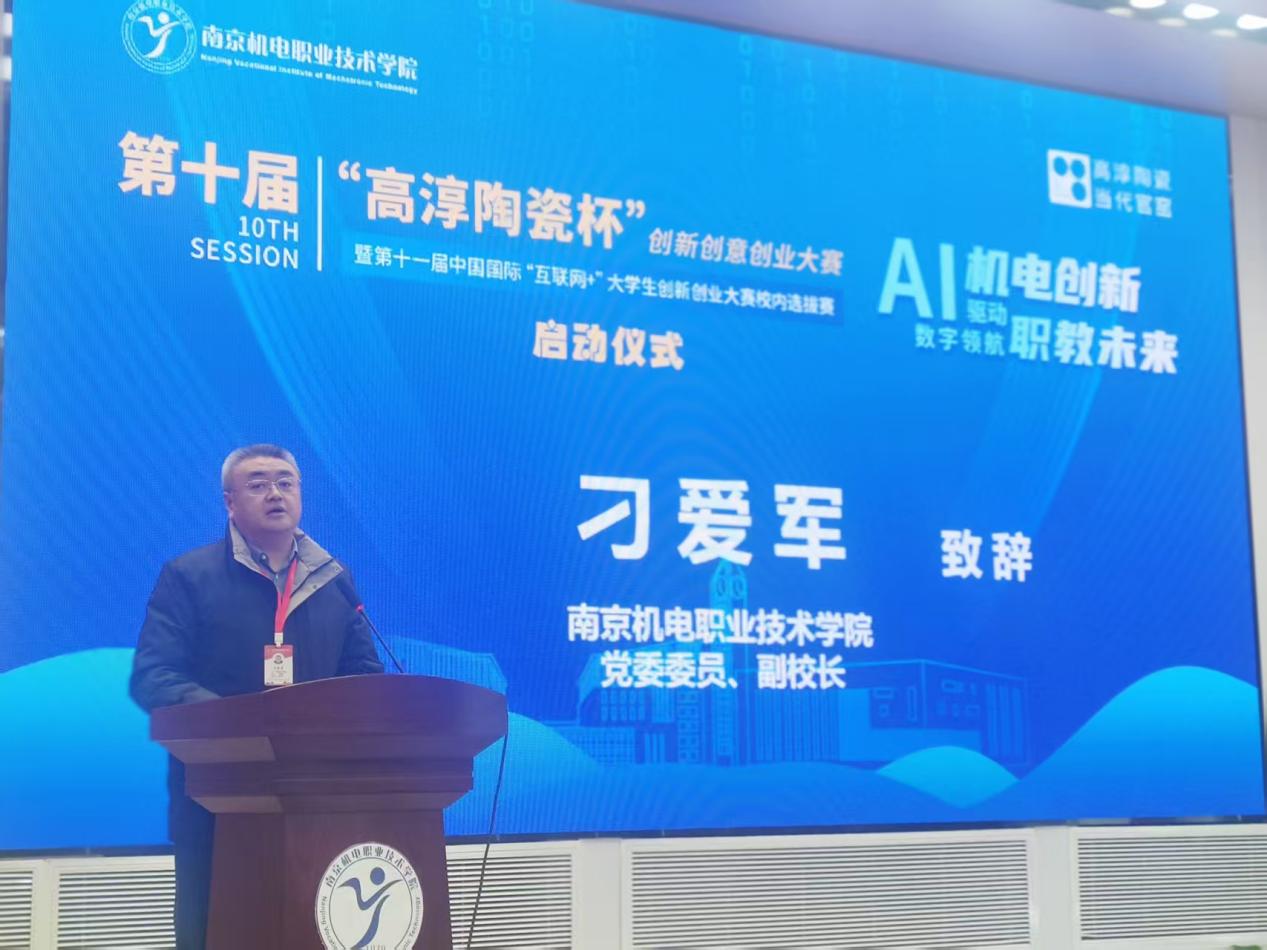 2025年3月18日,“AI驱动机电创新,数字领航职教未来”开元第十届“高淳陶瓷杯”创新创意创业大赛暨第十一届中国国际“互联网+”大学生创新创业大赛校内选拔赛启动仪式在乐学楼102报告厅举行。南京市高淳区科技局局长、科协主席马启顺,南京高淳高新技术产业开发区管理办公室分管负责人倪友谊,南京高等职业教育创新创业园发展服务中心主任吴凯,江苏高淳陶瓷股份有限公司党委副书记、副总经理周玉明,学校党委委员、副校长刁爱军等领导出席启动仪式。300余名师生代表参加活动,共同见证大赛开幕。