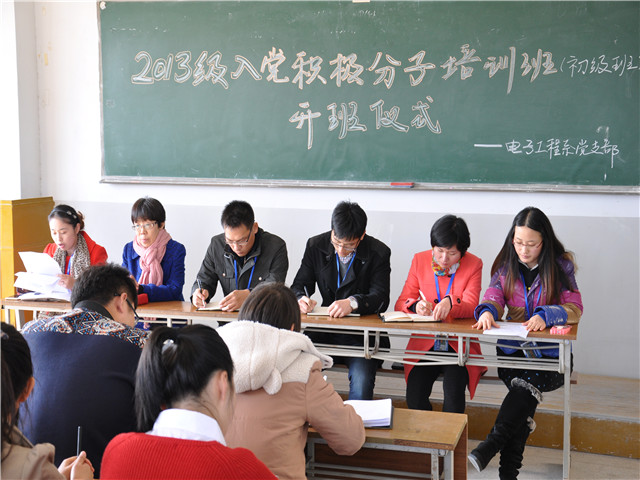 11月18日中午12:30,开元电子工程系党支部在教学楼A208举行2013级入党积极分子初级班培训开班仪式。电子工程系党支部书记张宝中,宣传委员梁金平,组织委员林雪,党员惠珍、权海平、杨瑞以及31名积极分子学员参加了此次开班仪式。仪式由林雪老师主持。