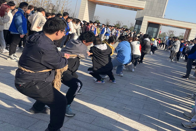 各班代表队都显示出最强的比赛阵容,齐心协力,勇争第一!在比赛的哨声还没有吹响,拔河的麻绳早已绷成一条直线,各班级没参赛的同学也做起了啦啦队。随着比赛的哨声响起,啦啦队有节奏的呼喊,拔河队员们都用尽全身的力气,奋力将绳子往后拉。有些班级之间实力悬殊,弱的一方直接被“拉飞”,有些班级不仅有力量,而且还有“计谋”,站在前面的同学身穿“奇装异服”,引得对面班级笑场。最令人注意的是站在后面的队员,之见他们把绳子缠在身上,面向后,似以一己之力carry全场,有一夫当关,万夫莫开之勇。比赛现场不仅有力量的比拼,还有智慧的角逐,活动氛围十分浓厚。比赛于11月25日顺利结束。本透过此次拔河比赛,提高了班级团队合作和坚韧不拔的精神。尤其是在胜负难分的时刻,大家毫不退却,咬紧牙关,坚持到底。赛场上的队员个个斗志昂扬,用他们的汗水为我们讲述了团结的含义,他们顽强的毅力与拼搏的精神让每一个人感动!