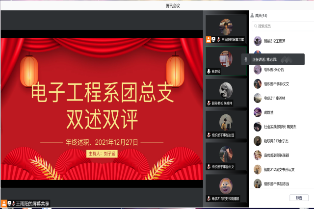 为深入学习贯彻习近平总书记关于青年工作的重要思想,深入实施“磐石工程”,加强团总支队伍建设,充分激发团总支建设活力,扎实推进教育实践工作。12月27日,电子工程系团总支于线上开展年度“双述双评”会议。此次会议由团总支副书记刘子涵主持,团总支书记林雪出席会议,团总支全体成员参加。