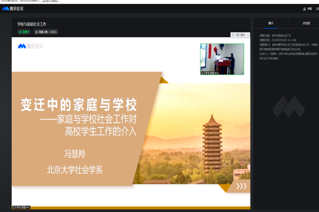 本次线上培训会由冯慧羚(北京大学社会学系助理教授,美国芝加哥大学社会工作专业博士)老师主讲。冯老师系统讲解学校社会工作和家庭社会工作,并就传统不良家庭和新时期不良家庭进行对比分析,特别是在当前疫情情况学校如何开展学生关心与思想教育工作。