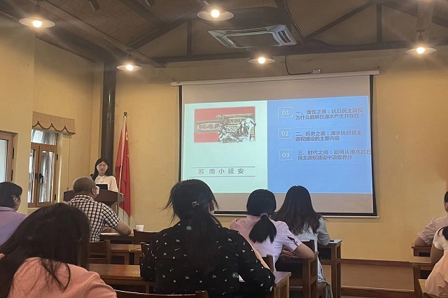 在两天的实地走访学习过程中,培训班也安排了“和平时期如何坚定理想信念,发挥党员先锋模范作用”的专题讨论,组织学员结合学院的“五亮”工程进行“头脑风暴”,探讨教师党员们在日常工作中发挥党员先锋模范作用的可行路径,电子系党员老师们积极踊跃参与讨论。此外,培训班还邀请了溧水区委党校的郝宇老师为我们专题讲授了溧水抗日民主政权建设及其时代价值。郝宇老师以“苏南小延安的立足之道”为关键词,娓娓道来,帮助学员们理解溧水抗日民主政权建设的艰辛及其对中国革命具有的重要意义,提高学员们的理论水平,锤炼学员们的党性修养。