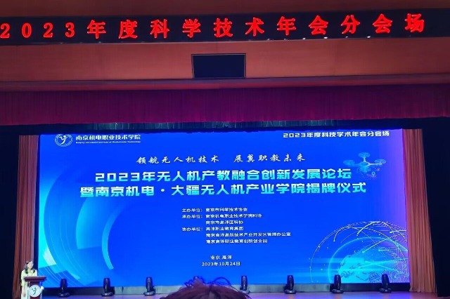 2023年10月24日下午,2023年度科技学术年会分会场——无人机产教融合创新发展论坛暨南京机电•大疆无人机产业学院揭牌仪式在学校青春剧场顺利举行。本次活动由南京市科学技术协会主办,由开元科协、南京市高淳区科协承办,由高淳职业教育集团、南京高等职业教育创新创业园等共同协办。南京航空航天大学研究生院副院长郑祥明,南京航空航天大学飞行器设计专业工学博士、教授唐正飞,高淳区科学技术协会副主席杨腊斌,南京高等职业教育创新创业园党工委委员、副主任孙爱国,深圳市大疆创新科技有限公司华东区代表滕菲,南京弘谷信息科技有限公司总经理赵华君,南京弘谷信息科技有限公司副总经理顾启凌,学校党委委员、副校长刁爱军,党委委员、纪委书记、工会主席姜振宇等领导出席本次活动。本次活动由学校科研及校企合作处处长李木香主持,电子工程系全体教师及学生代表,高淳职业教育集团理事单位江苏省高淳中等专业学校和高淳第一中学的师生代表参加了本次活动。