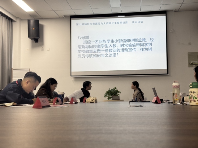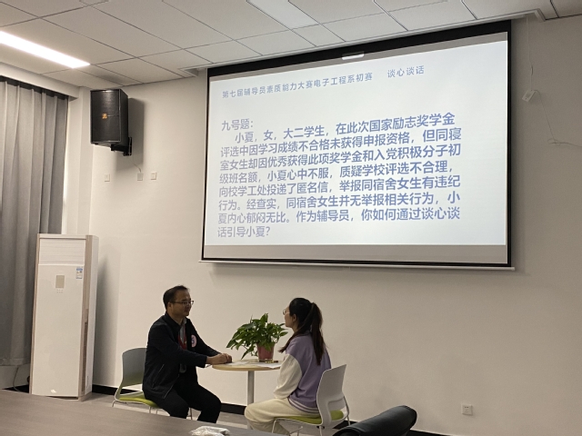 大赛在紧张而有序的氛围中拉开帷幕。电子工程系的全体专职辅导员齐聚一堂,他们精神饱满,准备充分,展现出了良好的专业素养和积极向上的精神风貌。比赛共分为三个环节:我为辅导员加油、谈心谈话和案例分析。