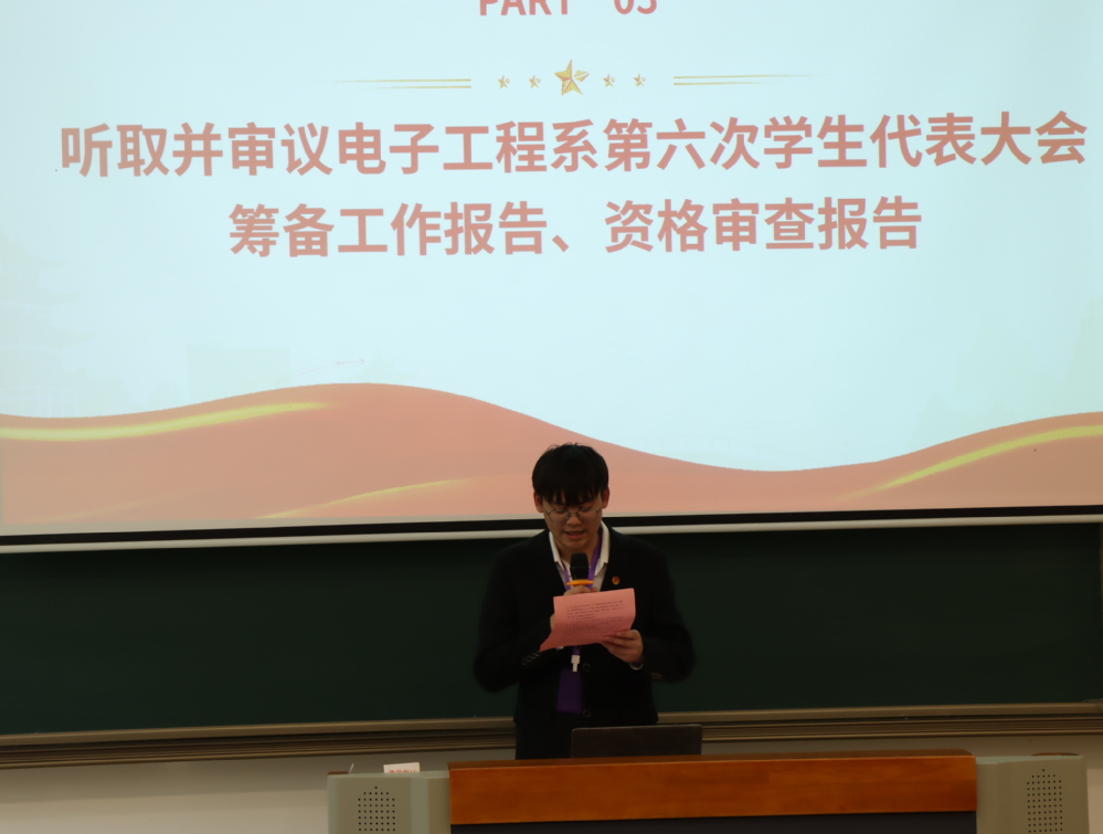 5月14日下午,电子工程系第六次学生代表大会在勤学楼102胜利召开。本次大会汇聚了系党支部副书记叶绘、学生会指导老师朱倩、团委书记魏澜、心理健康指导老师禹花宁以及系部学生会成员、各班班长及学生代表的积极参与,会议旨在完善工作交接,公开、公正地选拔出电子工程系未来的主席团人选。