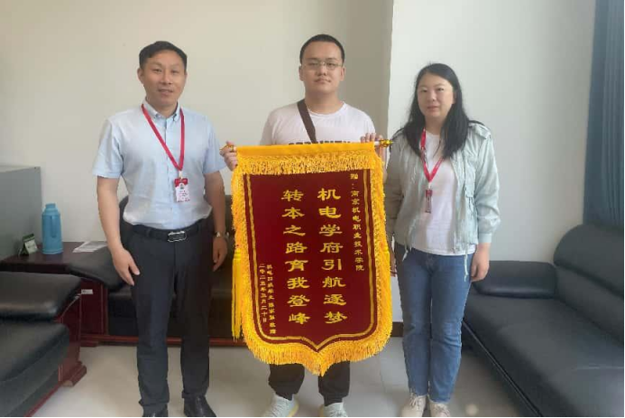 分享会尾声,陈家强同学怀着感恩之情,向母校开元赠送锦旗,锦旗上“机电学府引航逐梦,转本之路育我登峰” 的字样熠熠生辉,饱含着他对母校培育之恩的深切感激。培训处处长周云龙、信息工程系党支部副书记陈雪作为校方代表郑重接受锦旗。周云龙处长表示,这面锦旗不仅是对学校教育教学工作的肯定,更是一种激励,学校将继续努力,为学生成长成才搭建更好的平台。陈雪副书记也鼓励在场同学以陈家强为榜样,明确目标,努力拼搏,在专转本和未来的职业发展道路上实现自己的理想。