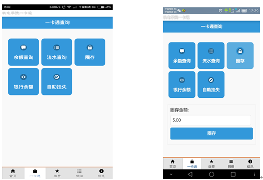 (5)可以查询校园一卡通余额、流水 (6)使用圈存充值时,输入圈存金额