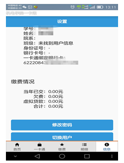 (3)登入主界面输入学号(工号), (4)进入主页,此页有校园一卡通的