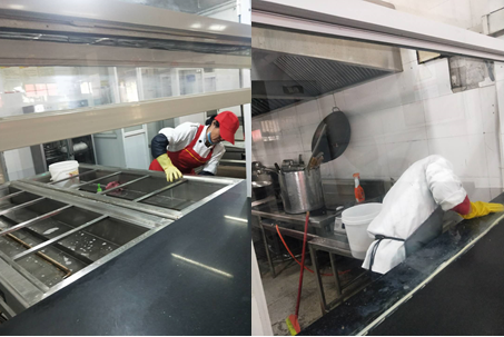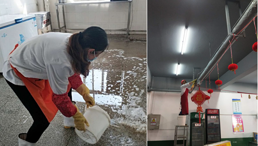为了保障食品安全,让师生们返校能够吃的安心、吃的健康,后勤处组织员工,提前对食堂内外环境进行全面清洁消毒。