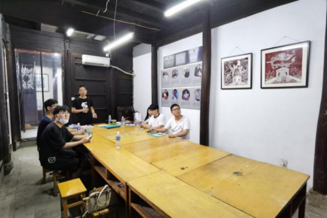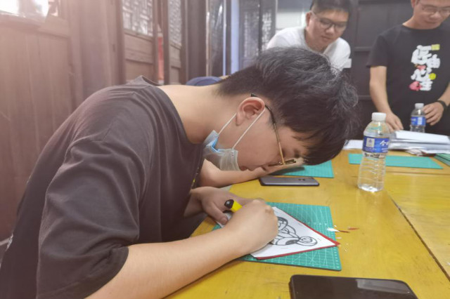 众所周知,金坛刻纸2009年入选“人类非物质文化遗产代表性名录”,成为了名副其实的世界级非遗。8月17日,朱倩老师带着学生们来到了金坛刻纸研究中心,在瞻仰了大师们的佳作之后,馆内工作人员王老师向团队成员详细讲解了刻纸的技艺特点,实践出真知,在听完老师的讲解之后,团队成员悉心体验了两天刻纸技艺,在反复的练习和摸索中,学生们逐渐掌握了一些技巧,比如:刀口不宜过长;刀口与纸的角度要尽量小;施力要慢且均匀等。在实践中,学生们感受到了传统艺术的魅力,并从自己的实践作品中获得了满满的成就感。