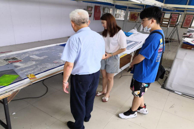 实践第七天,实践小团队来到了飞洋鱼制衣有限公司拜访杨兆群教授,杨教授亲自带领我们参观了正在刻制阶段的《大运河》长卷。他向学生们介绍,这幅长卷完工后,将成为现存刻纸作品中篇幅最大的一幅,并将在不久后展出。通过近距离的观察,小组成员们真切地感受到了刻纸长卷震撼的视觉效果和艺术传承人的工匠精神。