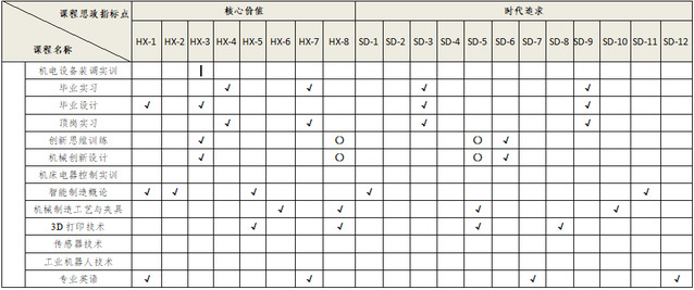 其次,团队成员结合自身所教课程,讨论并完善专业课程思政矩阵表。我们以思政二十条为脉络,逐一展开讨论。有老师认为:HX-1爱党爱国应该重点融入于专业核心课程中。HX-2公正法治可以在《智能制造概论》这类讲解先进技术的课程中有所体现;有老师提出:HX-3诚实守信应该贯穿于所有涉及到设计的课程中,设计应该坚持原创杜绝抄袭。HX-4和谐共生可以落实到《顶岗实习》这类课程中,教育学生步入社会后要学会与新环境相处;有老师建议:HX-5文化自信可在加工制造类课程中突出中国制造。HX-6工匠精神可融入到专业的每一门课程特别是实训类课程中;有老师指出:HX-7国防安全应该重点落实到校外的课程,因为我们有学生会在军工类企业顶岗实习,安全教育尤为重要。HX-8创新变革同样在所有课程中都很重要,有些课程还需要将其作为考核指标。按照同样的思路,我们又对时代追求中的12条展开讨论,最终完成矩阵表如下: