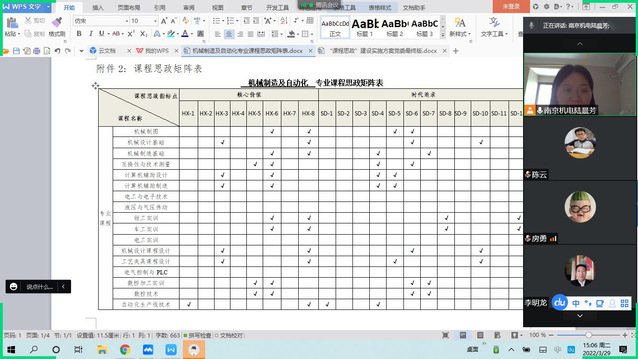 为贯彻落实《开元“课程思政”建设实施方案(2021年-2023年)》、更好地推进课程思政建设,2022年3月29日下午,机械制造及自动化教研室全体成员通过腾讯会议召开了主题为“课程思政建设研讨”的教研活动,旨在讨论专业课程思政元素、完善专业课程思政矩阵表,本次会议由陆晨芳老师主持。