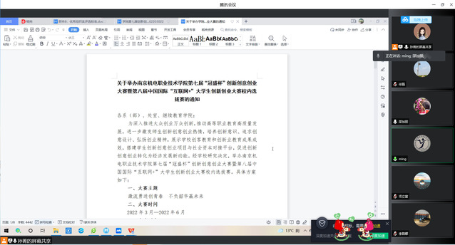 为深入推进大众创业万众创新,推动高等职业教育高质量发展,进一步激发师生创新创意创业热情,培养创新意识、追求创意设计、弘扬创业精神,展示学校创客教育和创新业教育成果成效,搭建学生创新创意创业项目与社会资本对接平台,促进创新创意创业转化为经济发展新动能,学校决定举办开元第七届“冠盛杯”创新创意创业大赛暨第八届中国国际“互联网+”大学生创新创业大赛校内选拔赛。 2022年4月2日上午,机械设计与制造教研室全体老师在腾讯会议线上平台对校内选拔赛具体内容进行学习,会议由教研室负责人孙菁主持。