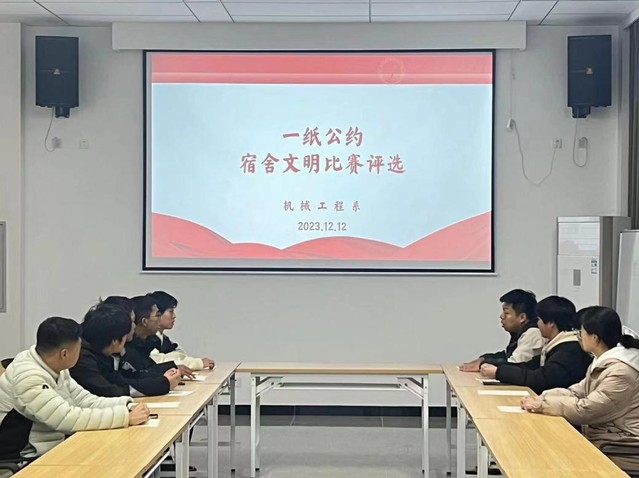 为丰富当代大学生的宿舍文化生活,树立积极健康的精神风貌,培养大学生热爱生活,热爱校园的情感,文明健康、积极向上的宿舍生活,营造美好和谐的宿舍环境,机械工程系学生会于2023年12月12日开展了“一纸之约,一室之暖”——宿舍文明公约比赛评选。此次评选由机械工程系学生会指导老师顾航主持。