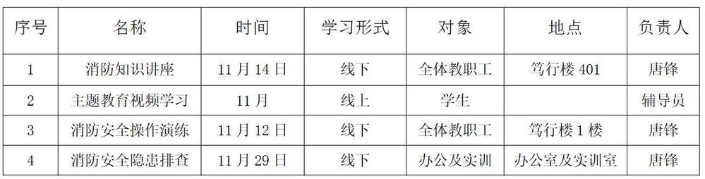 2024年11月9日是第33个全国消防日,主题是“预防为主,生命至上”。为持续深入学习贯彻习近平总书记关于应急管理重要论述,切实提升消防应急能力和基层消防治理水平,做好消防宣传月相关工作,保障宣传月期间消防安全稳定,根据省市及新工集团、机电集团统一部署为了创建平安校园,增强全体师生的安全意识,提高自我保护能力,我系根据上级部门要求决定将11月定为消防学习月,并开展一系列消防教育活动。现将相关事宜通知如下: