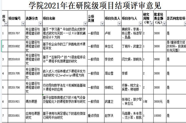 根据《关于2021年上半年院级在研科研项目结项的通知》、《开元科研工作管理办法》机电学院[2012]19号、《开元科研项目管理办法》机电学院[2012]20号文件精神,经科研及校企合作处审查,院专家组评审,批准我院2021年上半年学院在研科研项目26项通过结项鉴定。现将结项鉴定结果予以公示。