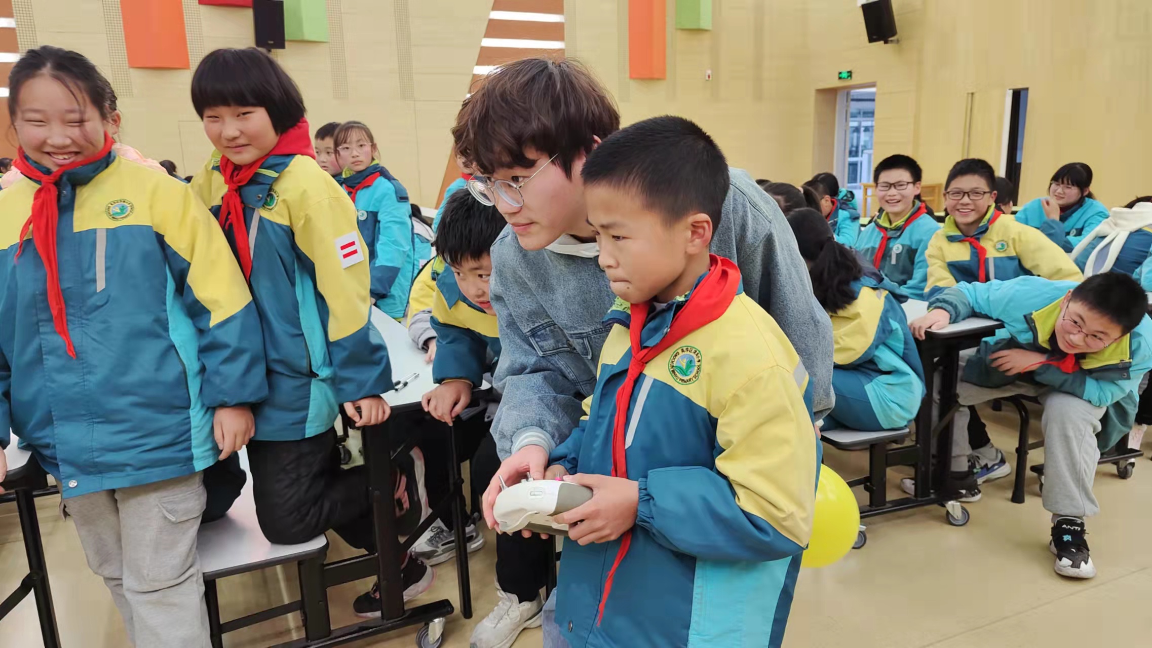 首先,朱老师通过精彩的讲解将学生带入机器人的世界,引起全场学生的好奇心和沸腾。随后,朱老师带领机器人社团社员们和同学们玩起互动游戏——机器人扎气球比赛。这短暂快乐的时光在气球的爆炸声和同学们的欢声笑语中过去,同学们也拥有了全新的体验,也在体验游戏的过程中加深了对智能机器人的兴趣爱好。