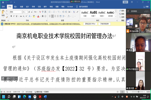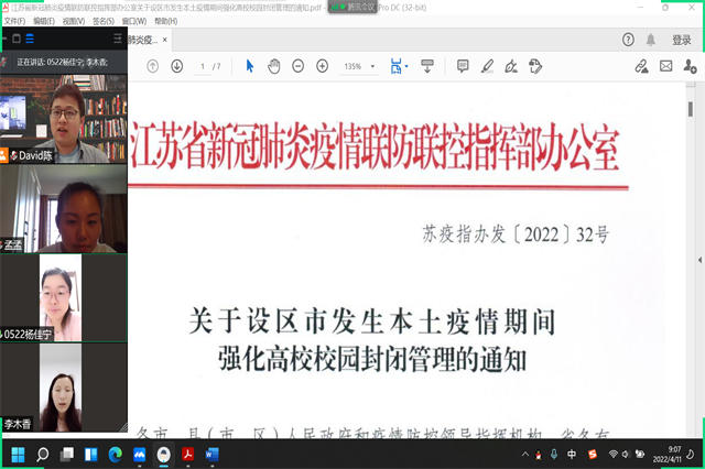 2022年4月11日,为落实江苏省教育厅和学院党委对疫情防控的部署要求,科研及校企合作处李木香处长组织部门全体成员通过腾讯会议认真学习了江苏省《关于设区市发生本土疫情期间强化高校校园封闭管理的通知》和《开元校园封闭管理办法》等相关文件。重点强调了强化封闭管理、严格执行健康报告制度、做好返校人员资格审核、强化核酸检测、强化快递外卖管理、加强活动管理、加强个人防护等相关规定。