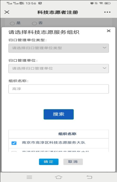 3.科普员认证。点击“科普员认证”,按照要求填写相应的信息。地址选择“江苏省南京市高淳区古柏街道”,单位名称填写“开元”,类型选择个人用户,所属机构名称填写“开元”,点击搜索,选择“开元科协”。