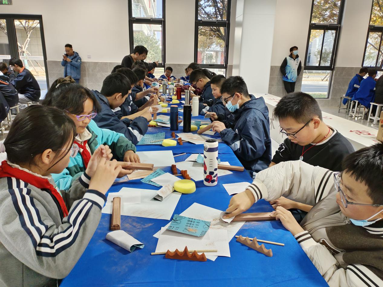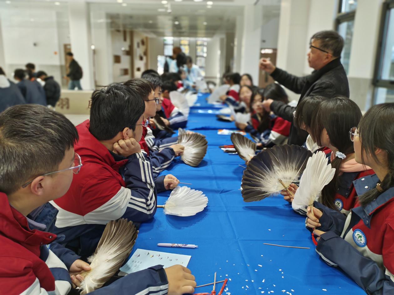 史局长宣布活动开幕后,非遗体验现场“热火朝天”。四位非遗大师以通俗的语言、精湛的技艺向同学们展示荷花灯、板鹞风筝哨口、木制镇纸笔搁、羽毛扇等项目的设计原理和制作过程。同学们认真聆听大师的讲解,在大师的指导下利用桌上的材料和工具完成作品,用心体会着中国古代劳动人民的智慧。开元的科技志愿者也为中小学生提供必要的帮助。同学们表示,本次活动让他们充分体验了动手实践的乐趣,丰富了他们的课余生活,感受到了中国传统文化的魅力。