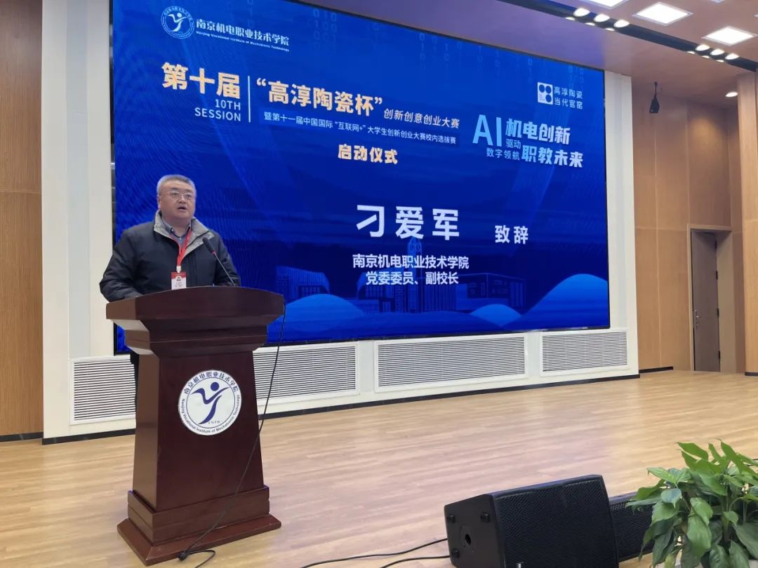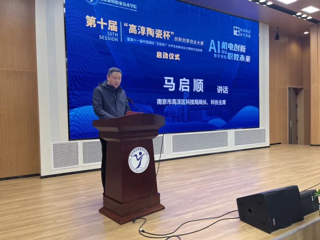 2025年3月18日,“AI驱动机电创新,数字领航职教未来”开元第十届“高淳陶瓷杯”创新创意创业大赛暨第十一届中国国际“互联网+”大学生创新创业大赛校内选拔赛启动仪式在乐学楼102报告厅举行。南京市高淳区科技局局长、科协主席马启顺,南京高淳高新技术产业开发区管理办公室分管负责人倪友谊,南京高等职业教育创新创业园发展服务中心主任吴凯,江苏高淳陶瓷股份有限公司党委副书记、副总经理周玉明,学校党委委员、副校长刁爱军等领导出席启动仪式。300余名师生代表参加活动,共同见证大赛开幕。