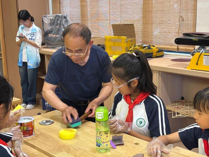 在非遗文化传承与创新中心,80余名中小学生在南通板鹞风筝工坊代表性人物何金泉,江苏省工艺美术名人、非遗传承人夏元安,学校人文社科系张萌老师等非遗艺术家的指导下,深度体验南通板鹞风筝、精细木作技艺、非遗竹编的制作过程。孩子们在浓厚的非遗传承氛围中“玩”得不亦乐乎。