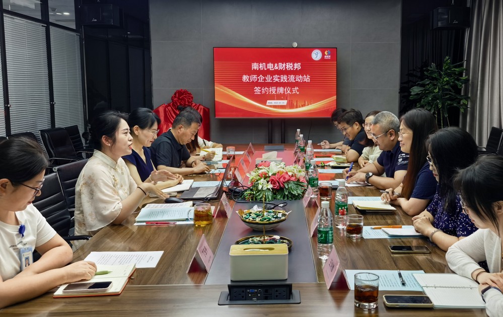 2025年7月14日,南机电-财税邦教师企业实践流动站签约授牌仪式在江苏财税邦科技有限公司举行。江苏财税邦科技有限公司创始人兼总经理毛友俊,总经理高霞,运营总监杨青培训总监张苗苗,学校党委委员、副校长刁爱军,科研及校企合作处处长李木香,人文社科系副主任啜春红等领导出席本次活动,南机电-财税邦教师企业实践流动站全体进站教师及企业导师参加本次活动,共同见证南机电-财税邦教师企业实践流动站建设与运行拉开帷幕。
