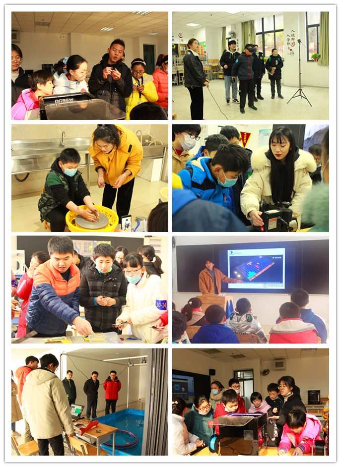 26日上午,科技体验活动正式开始。蓝岛创客空间成员及学生志愿者准备了创客工具,设备和材料,为本届科技节带来3D打印、水中游鱼机器人、魅力热转印、VR体验、领略陶艺之美、刺客机器人、智能硬件及激光的力量等丰富的创客体验项目。在3D打印工坊,学院志愿者为中小学生介绍了3D打印技术原理,并通过实物展示了3D打印的操作流程;在水中游鱼机器人项目中,志愿者为参观的领导和学生介绍水中机器人包含的编程和调控技术;在热转印工坊中,志愿者为小朋友讲解了热转印技术的原理,并指导中小学生制作热转印马克杯,每一位体验的小朋友都得到了定制马克杯;在VR工坊,在志愿者的协助下,中小学生佩戴VR头盔,手持手柄,体验身临其境的VR游戏;在陶艺工坊,志愿者为小朋友们展示陶艺作品的制作方法,并鼓励他们自主体验陶艺制作过程;在刺客机器人项目中,小朋友们操控遥控器体验机器人扎气球;在智能硬件工坊,志愿者为小朋友们介绍智能硬件Arduino的原理及其广泛应用;在激光切割工坊,小朋友们体验设计图案、激光雕刻、打磨剖光等书签制作全过程,并都得到了一枚定制书签。