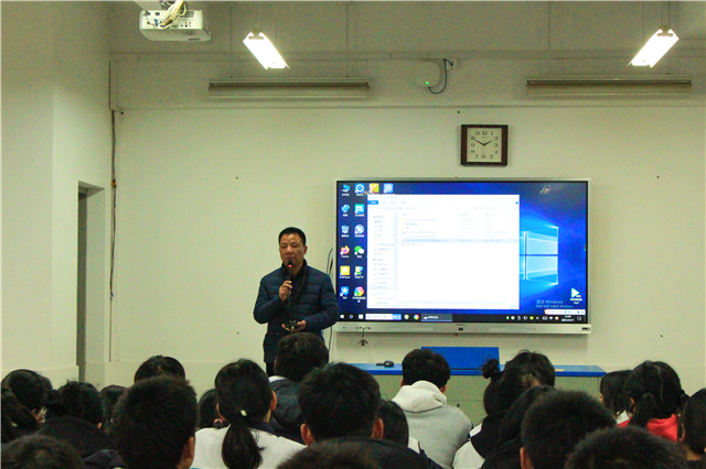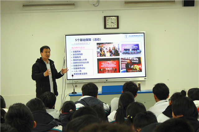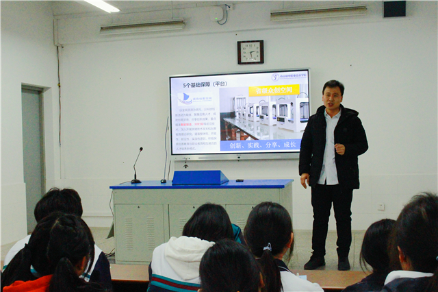 江苏省高淳中等专业学校副校长钱自豪对王主任的到来表示热烈欢迎。随后,王国珍主任结合自己的创新经历向在座师生介绍了我校倾力打造的创客校园文化。王主任说,开元于2015年建设国内首家创客校园,倾力打造集创意、设计、制造于一体的蓝岛创客空间,系统设计了“54333”创客教育体系。在学校的积极引导和政策鼓励下,全院师生的创新能力显著提高,专利申请和授权数量不断增加,学校逐渐形成了“人人皆能创新,人人皆可创新”的创客校园环境。王主任勉励在座学生:创新需要积累,用手机上的备忘录把每一个生活中不经意的想法记录下来,不断挖掘生活中的痛点,思考并不断优化解决方案,在日积月累之中,创意也许就会出现在眼前。现场师生报以热烈的鼓掌。