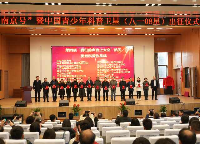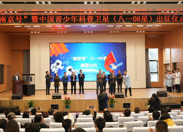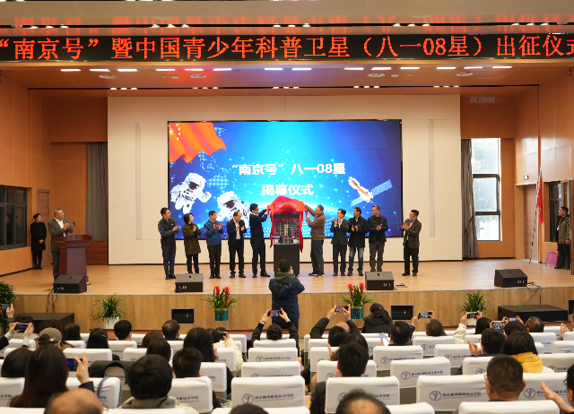 会上,南京新工集团领导、南京市教育局领导相继致辞,中国航天科技国际交流中心周岫彬致辞并授牌开元“八一08星工程校”,与会领导嘉宾上台共同见证“南京号”八一08星揭幕这一重要里程碑时刻,并合影留念。