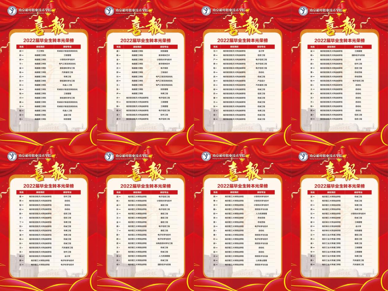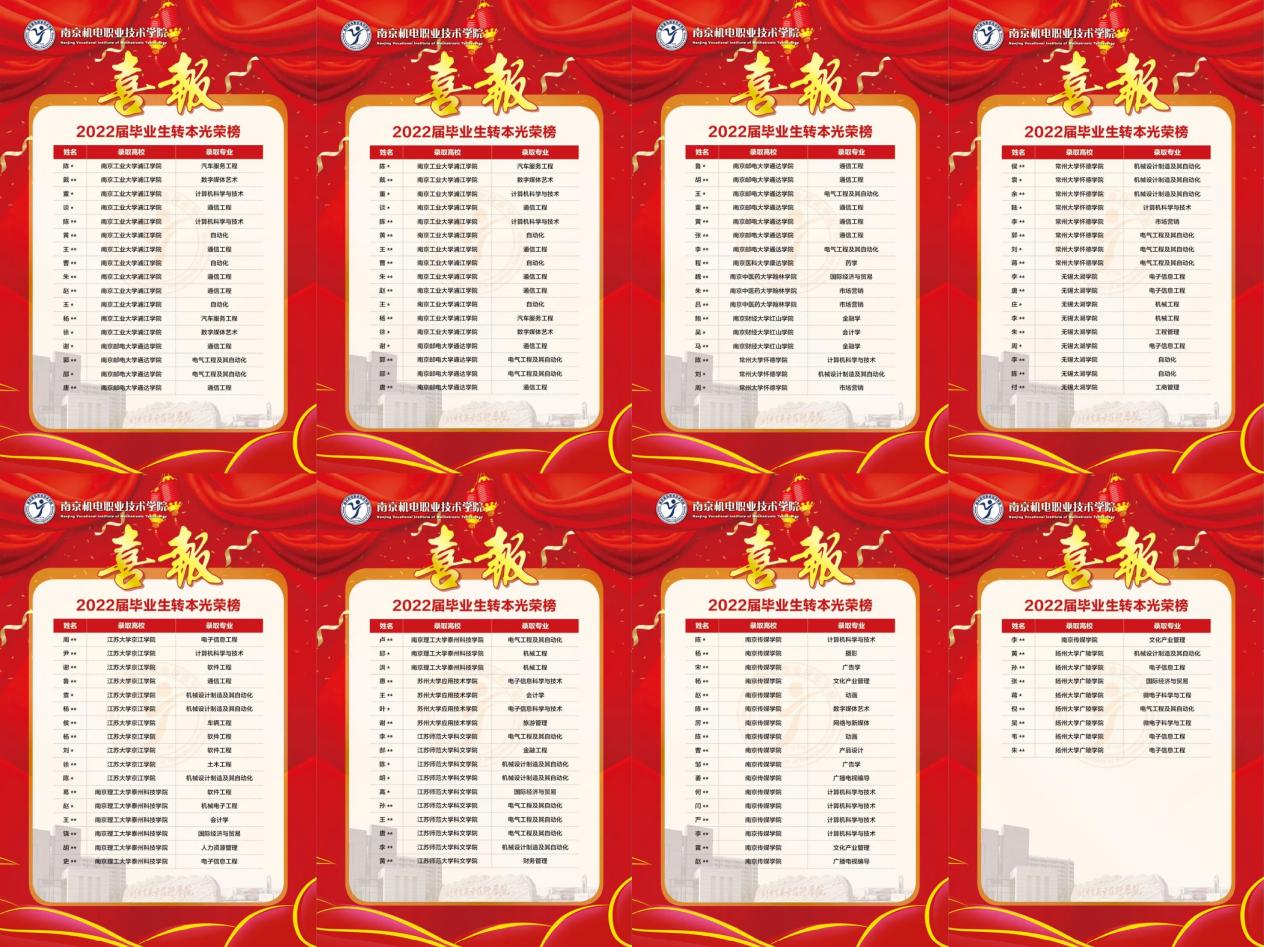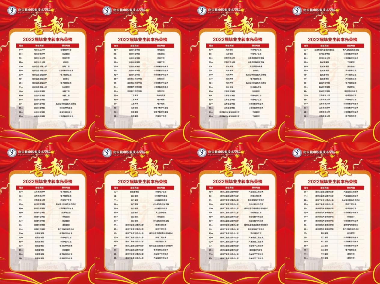 我校学生在2022年“专转本”选拔考试中取得了优异成绩,再创辉煌。本次考试我校共计400名毕业生被省内本科高校录取,录取率达54%,录取率高出全省平均录取率12%,在全省同类高校中名列前茅。其中162名被南京工业大学、南京邮电大学、南京林业大学、南京信息工程大学、江苏大学和江苏师范大学等公办高校录取。