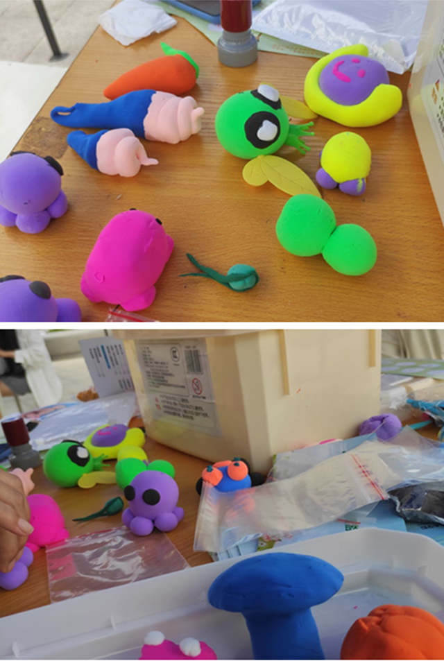 随后游园会的重头戏-人文系心理气象站组织的“粘粘乐”活动正式开场了,在现场负责人的引导下,同学们大胆创新,用粘土结合丰富的想象力创造出各种各样的奇趣造型,有脑袋很大绿色的外星人,有萌萌大眼睛的金鱼,有紫色的郁金香……大家在这个“六一”感受着无拘无束的童趣,这一幕治愈而温馨,真是一次良好的心理体验。