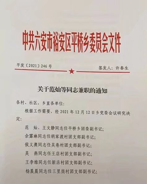 日前,人文社科系收到会计191班范灿同学兼职文件,范灿同学2021年12月12日起兼任六安市平桥乡团委副书记。范灿同学系人文社科系团总支第八届学生副书记。